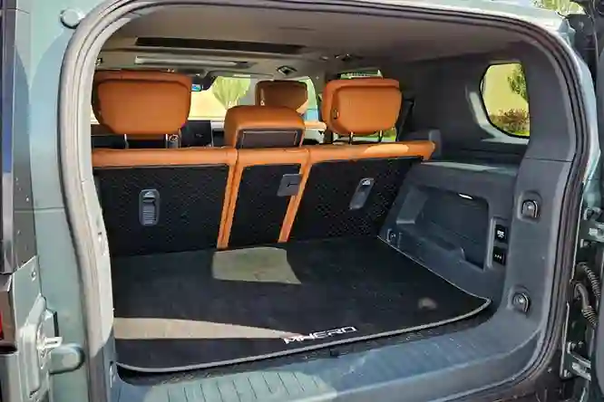 Из приятных вещей: два ярких плафона, несколько крепежных петель, две розетки (одна на 220 Вольт), а также кнопки управления пневмоподвеской и складыванием спинок заднего ряда. На внутреннюю часть багажной двери можно повесить пару пакетов (по 3 кг).