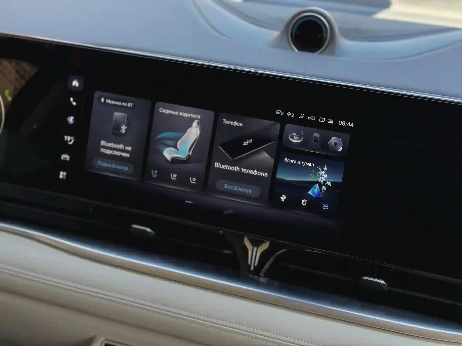 Внутри царит роскошь. Передняя панель, по нынешней моде, здоровенный экран от стойки до стойки. В глянцевой черноте прячутся три дисплея диагональю по 12,3 дюйма каждый — цифровая «приборка» и пара тачскринов — общий центральный и персональный у переднего пассажира.