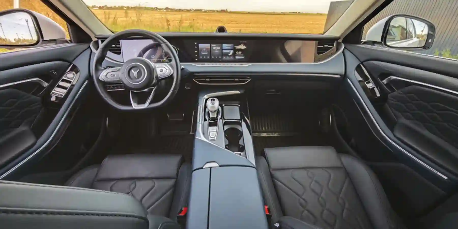 Панель приборов здесь необычная, «живая», способная вместе с тремя экранами перемещаться вверх-вниз, но об этом чуть позже. В целом салон стильный. С большим количеством физических кнопок.